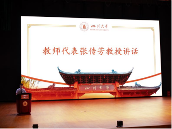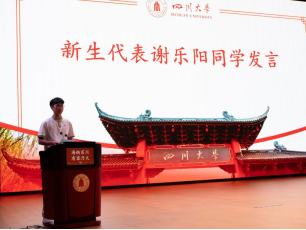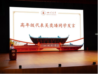 2023级学生吴奕璠同学代表各位学长学姐发言。她以自己两年来在川大的所见所闻所感希望学弟学妹们能够认识自己,提前规划,坚持学习,勇于创新,书写人生篇章。在日常生活中培养综合能力,施展个人才华,充实地度过大学四年。