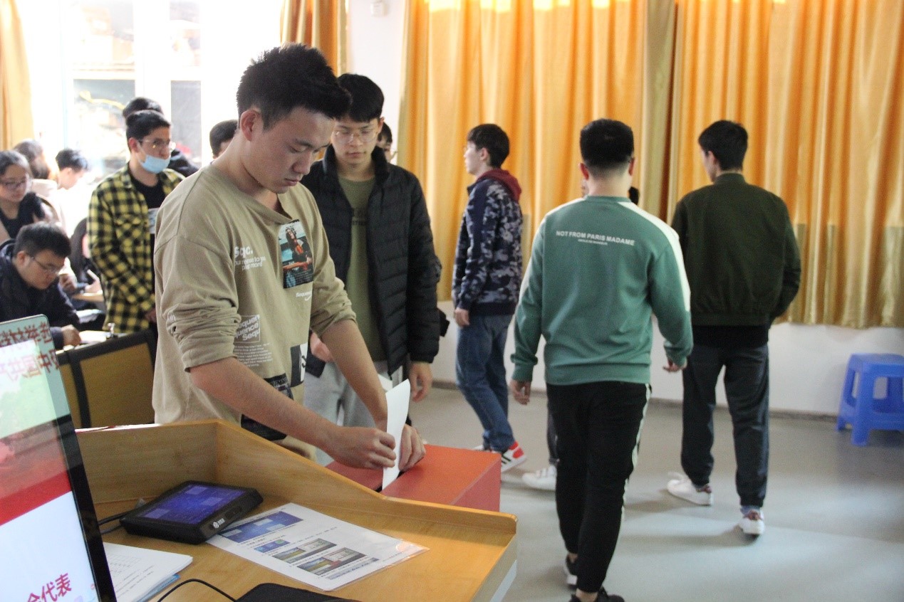 大会的第三阶段是选举新一届的学院学生会主席。首先由主持人展示主席候选人基本信息,而后由候选人发表竞选演讲,最后由学生代表依次上台投票。